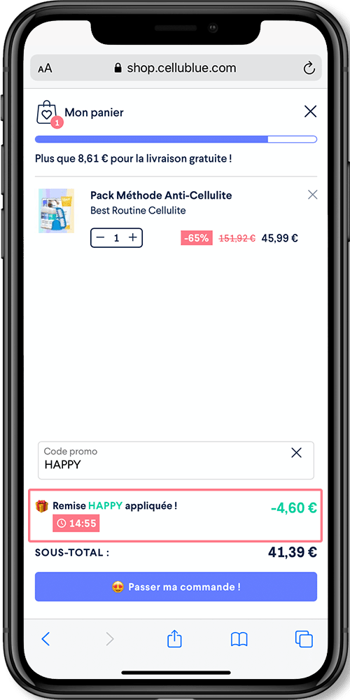 Nyní můžete vidět, že slevový kupón Cellublue byl úspěšně použit. Zobrazená částka již zohledňuje zadaný slevový kód. Nyní můžete pokračovat v nákupu vyplněním dalších požadovaných údajů.