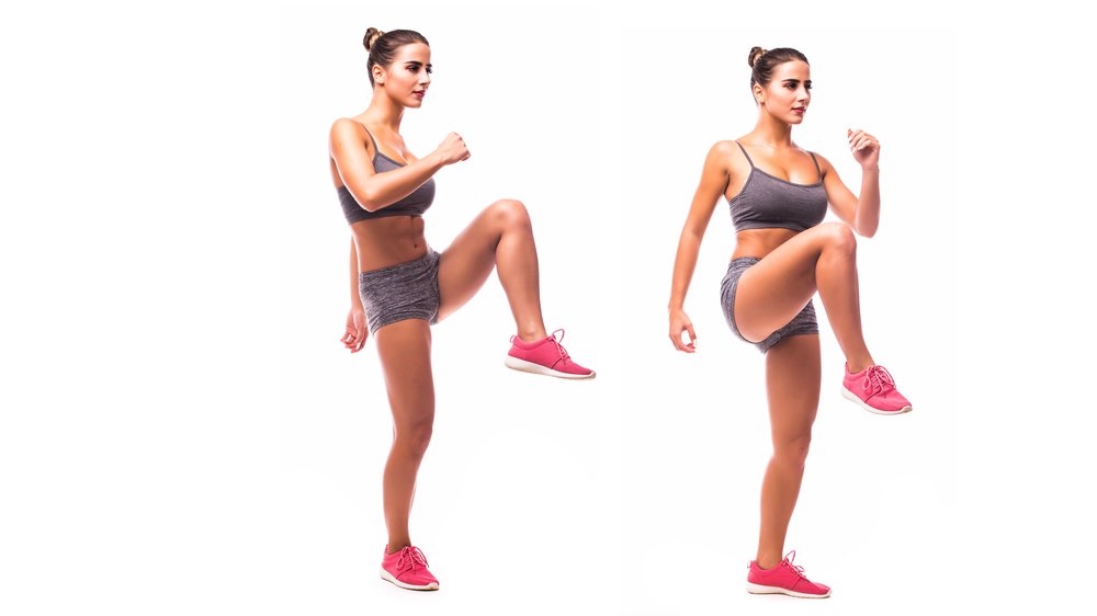 Postavte se, zpevněte břicho. Střídavě zvedejte levé a pravé koleno směrem k hrudníku. Opakujte co nejrychleji po dobu 30 sekund.