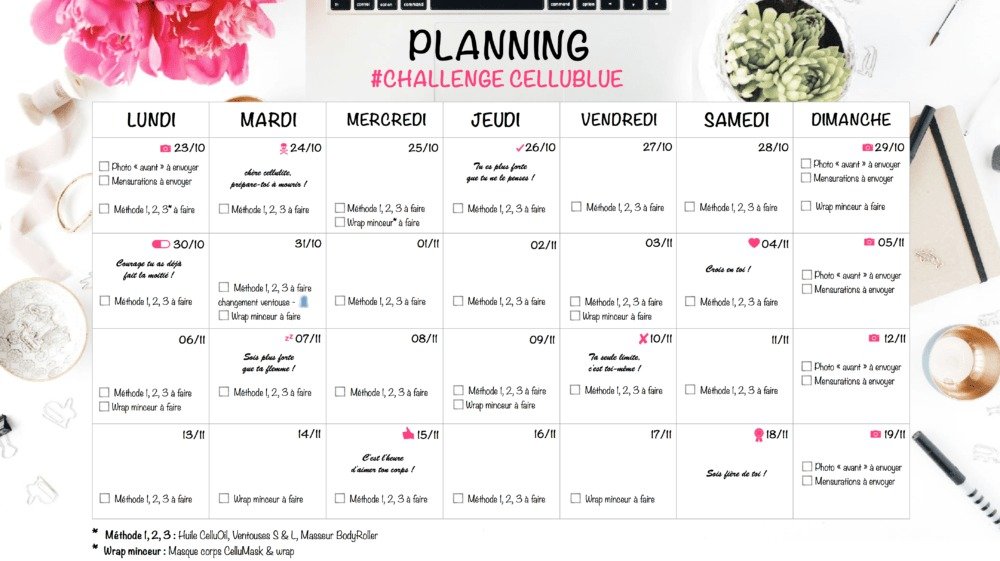 Wenn Ihr Ziel schlanke, definierte, straffe und wohlgeformte Beine sind, dürfen Sie sich freuen – denn wir starten heute den Challenge Schlanke Beine! Einen Monat lang machen Sie es wie unsere 5 aktuellen Markenbotschafterinnen und erleben Sie die kombinierte Wirksamkeit von unserer Anti-Cellulite-Methode in 3 Schritten und dem Wrap Minceur Intensif. Um Ihnen zu helfen, Ihr Ziel zu erreichen und den ganzen Monat durchzuhalten, haben wir einen übersichtlichen Wochenplan vorbereitet – mit motivierenden Sprüchen, damit Sie nicht aufgeben, und vor allem mit genauen Angaben, welches Produkt Sie jeden Tag verwenden sollten.