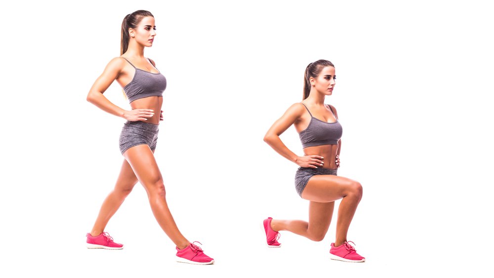 Stand with your feet hip-width apart, back straight and hands on your hips. Take a big step forward, then bend your front knee to 90°. Push through your front leg to return to the starting position with legs straight. Complete 15 reps, then switch legs.