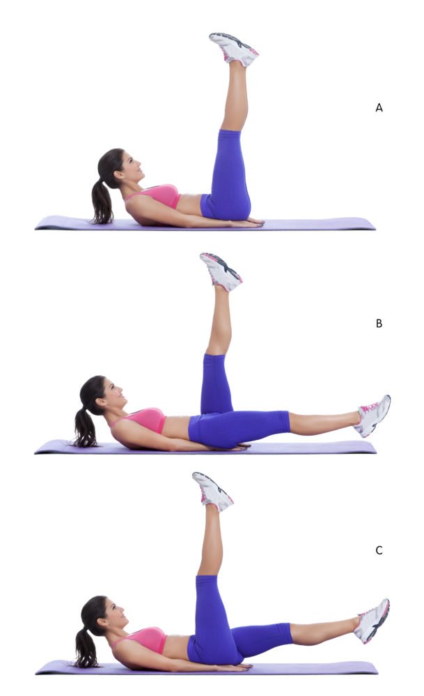 Lie on your back with your arms above your head or resting along your sides. Extend your legs and lift them slightly off the ground, making sure to keep your abs engaged. Hold this position and cross your legs while keeping them straight, alternating right leg over left leg.Complete 30 repetitions (1 rep = right leg + left leg).