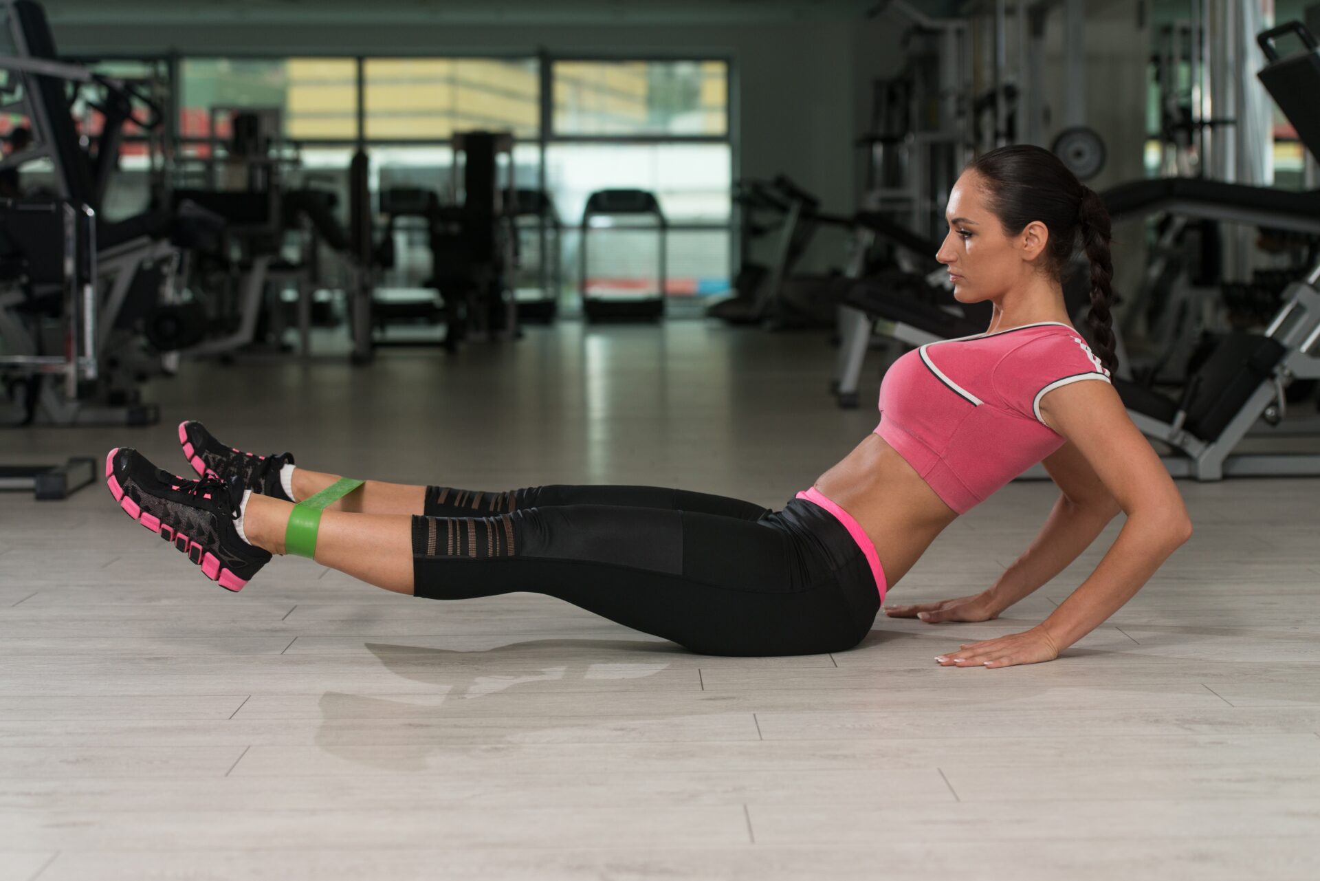 - Siéntate en el suelo con las piernas extendidas frente a ti. Coloca la banda elástica bajo las plantas de los pies y sujeta cada extremo.