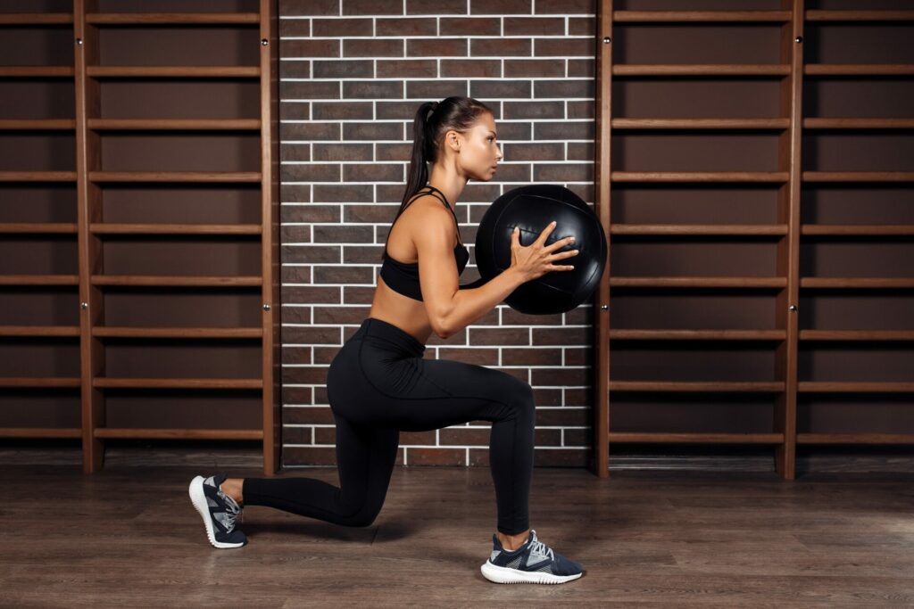 ¿La ventaja de la pelota? ¡Impedirte coger impulso con los brazos! Realiza 2 series de 20 zancadas (10 de cada lado).