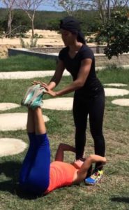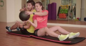 Tomen una pelota y siéntense de frente con las piernas flexionadas y entrelazadas. Acuéstense. Deberán realizar los abdominales de tal manera que se pasen la pelota la una a la otra en cada flexión. (4 series de 15 con intervalos de 1 minuto).