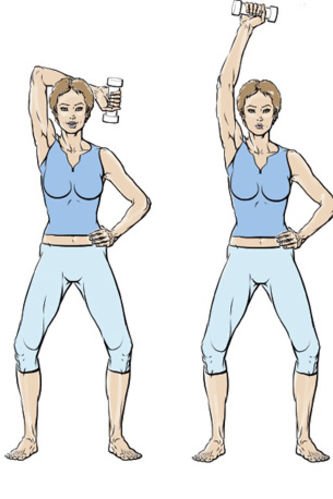 En posición de sentadilla, con los pies separados al ancho de la cadera y rodillas ligeramente flexionadas, llevamos los brazos por detrás de la cabeza sujetando una mancuerna. Deberán estirar completamente los brazos hacia arriba y volver a encoger. Repeticiones: 3 series de 15.