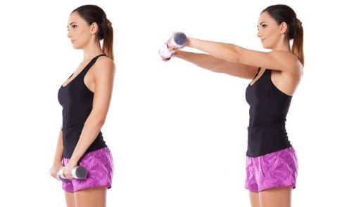 Como en el ejercicio anterior, de pie, pies separados al ancho de las caderas y rodillas ligeramente flexionadas, agarren una mancuernaen cada mano y flexionen un codo levantando el peso, luego bajen controladamente y repitan la operación con el otro brazo. Repeticiones: 3 series de 10-12.