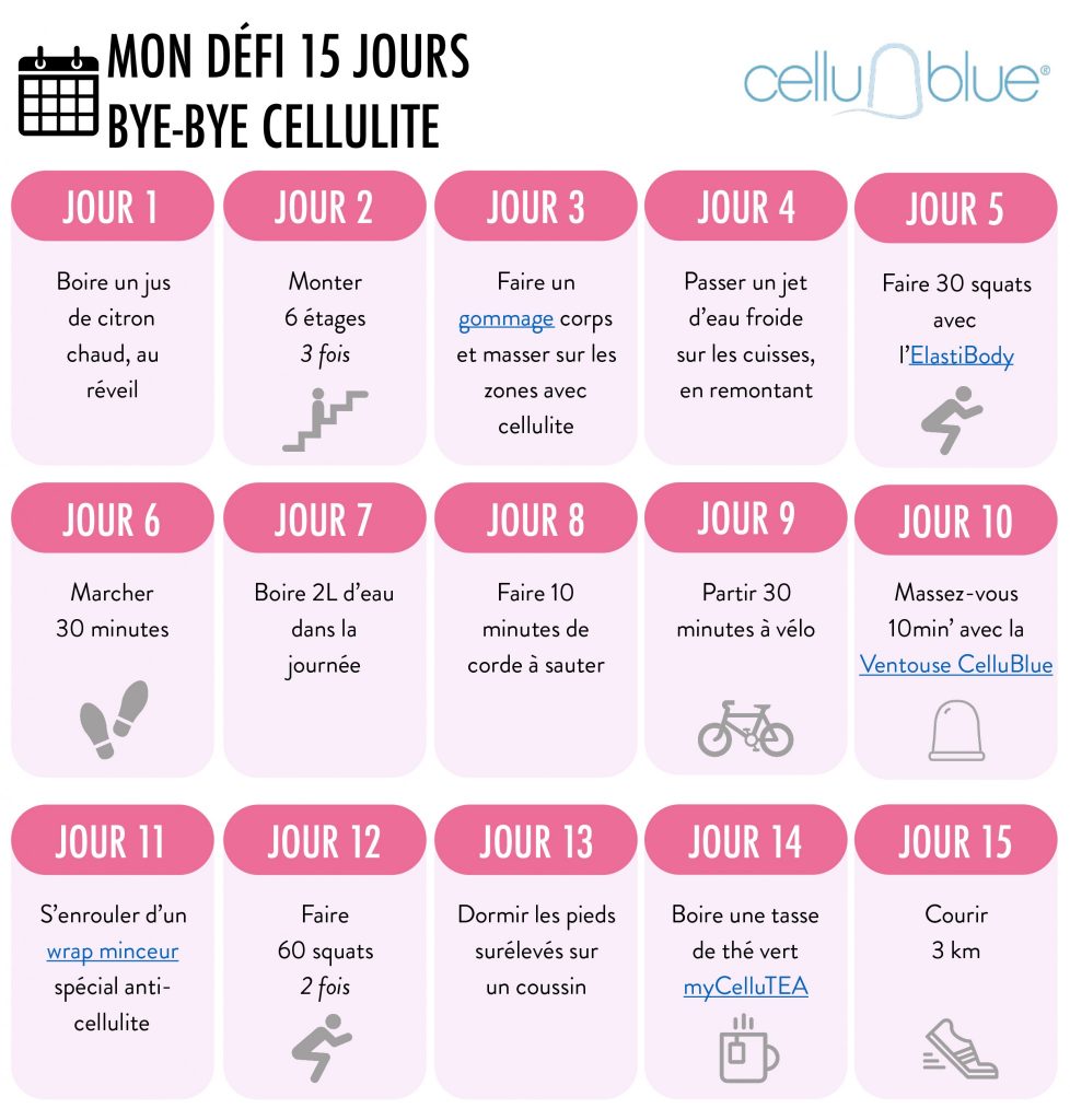 Vous êtes à la recherche de techniques efficaces pour venir à bout de la cellulite ? Vous avez envie de retrouver un ventre plat et des cuisses parfaitement raffermies ? Si vous avez aimé notre Défi 2017 et nos petits conseils pour réduire les capitons et la peau d’orange, et que vous souhaitez continuer l’aventure avec nous, nous avons ce qu’il vous faut ! Un petit challenge de 15 jours avec, par jour, une astuce infaillible pour dire bye-bye à votre cellulite et retrouver une peau parfaitement lisse !