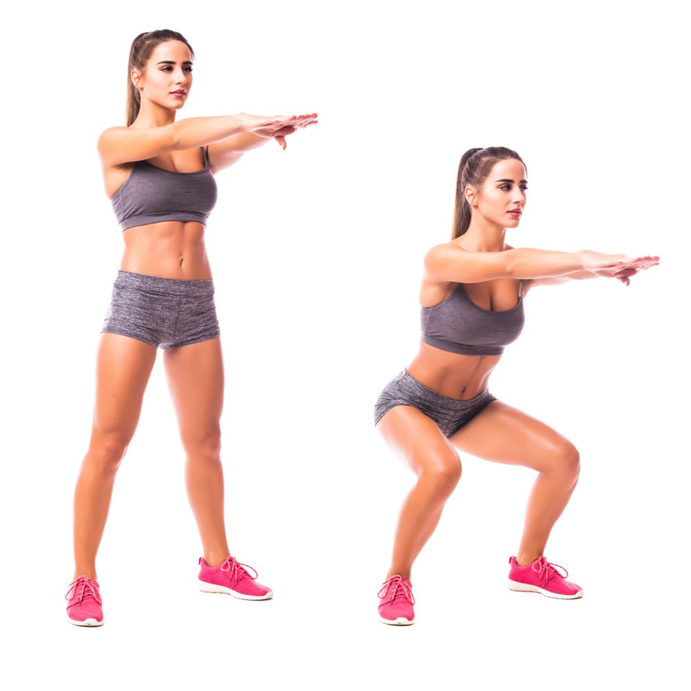 Pour ce premier exercice, mettez-vous debout en gardant le dos droit au maximum, pliez vos genoux jusqu’à vous retrouver en position assise : les fesses doivent dirigées vers l’arrière, le dos légèrement en avant et les genoux ne doivent pas dépasser la pointe des pieds. Pour remonter, poussez sur vos jambes vers le haut et contractez vos fesses pour un résultat optimal !