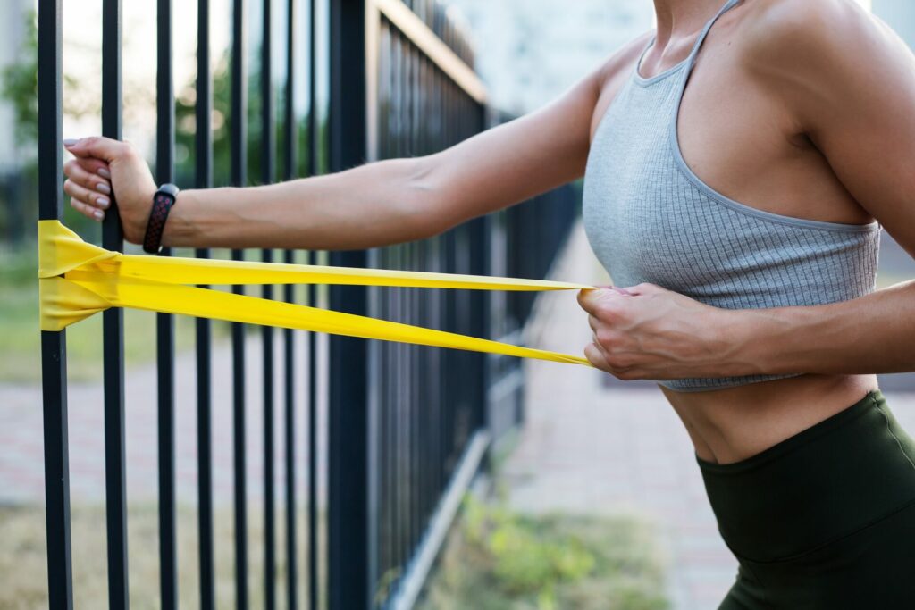 - À l’inspiration, tirez l’élastique vers votre poitrine. Les bras se plient, les coudes partent vers l’arrière.