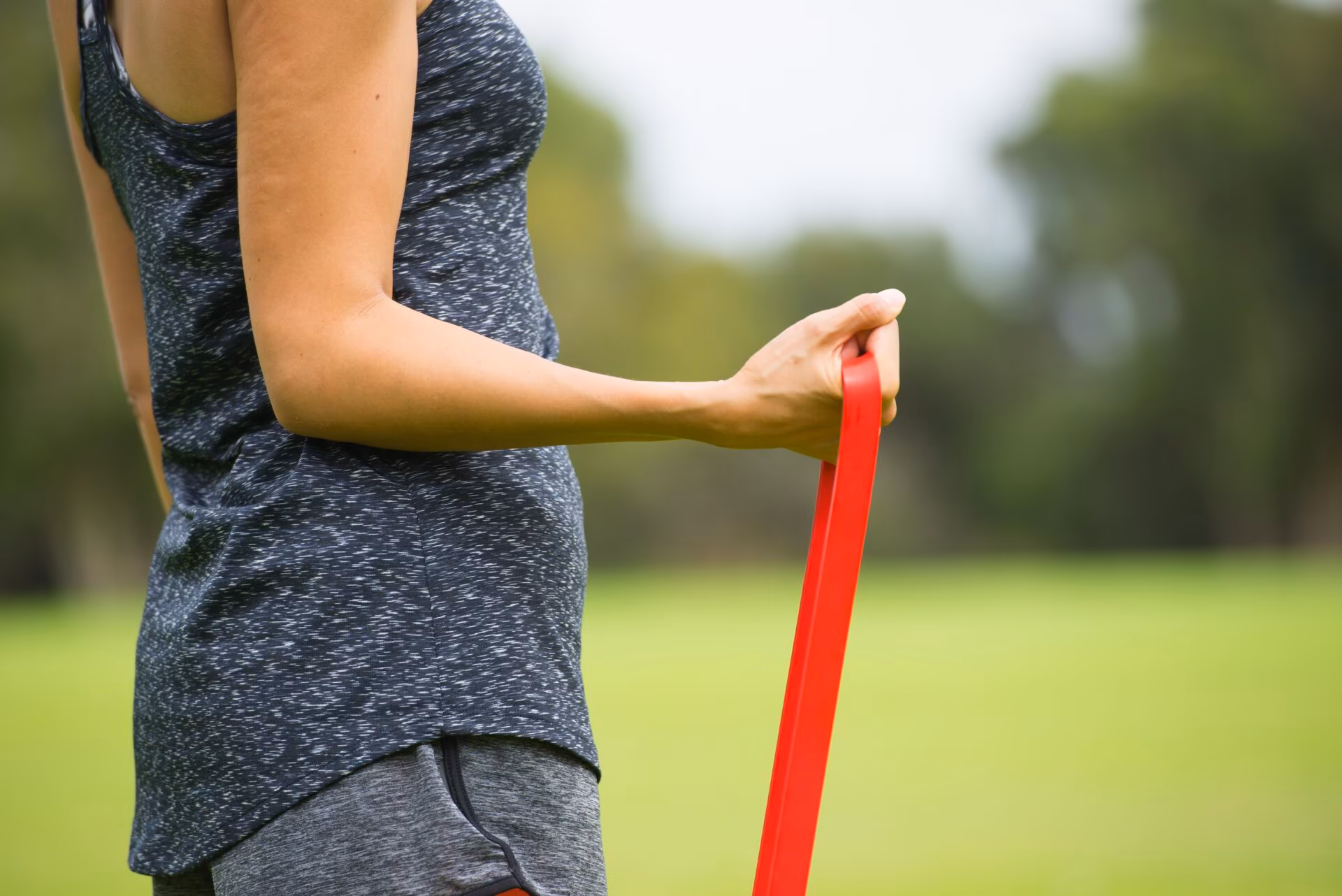 - Coloque o elástico por baixo das costas e segure-o com cada mão.